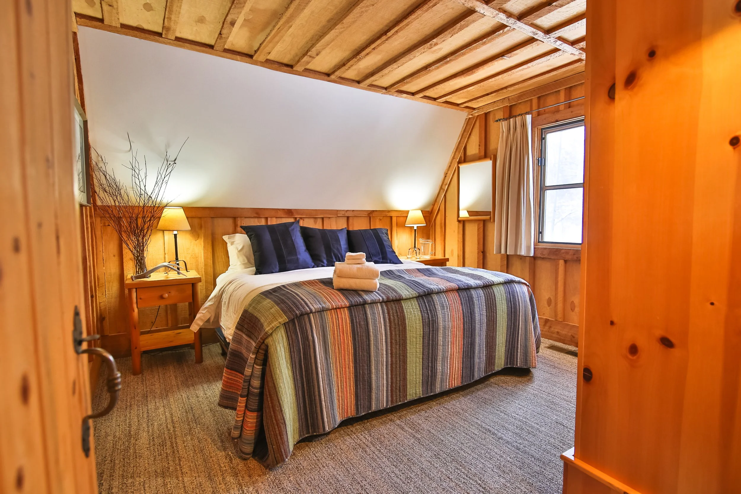 Rustic-chic main lodge upstairs rooms with queen beds, private bath and views over the terrace towards the pond and mountains. Third bed in shares is a single.